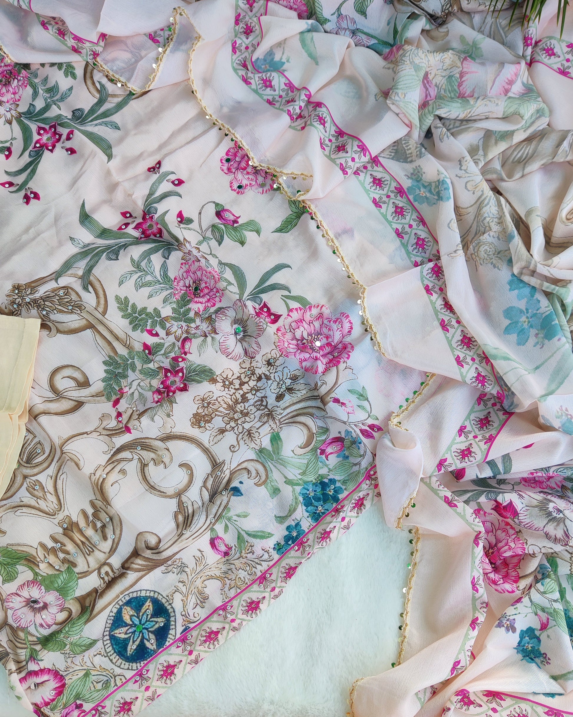 - perfect for a fresh and elegant look. The kurta features lovely blooming floral designs in pink, teal, and green tones. It comes with a matching printed dupatta finished with a delicate border and a comfortable cream trouser. Lightweight fabric makes it ideal for daytime outings, gatherings, and festive wear.