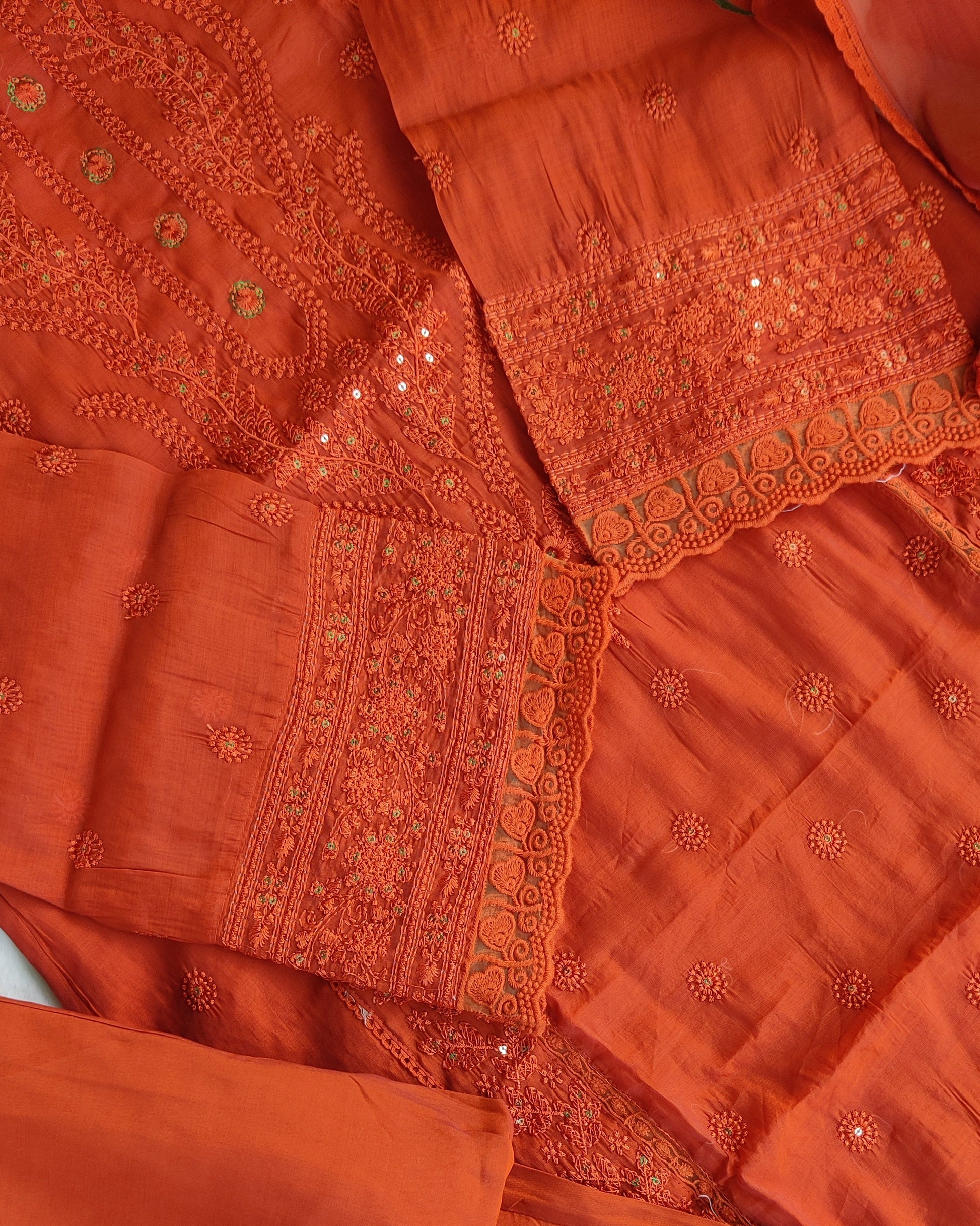Step into festive elegance with our Rust-Orange Mul Chanderi Suit Set, crafted from soft, luxurious Mul Chanderi. The kurta features intricate front embroidery, beautifully embroidered sleeves, and delicate lace detailing that adds a refined touch.