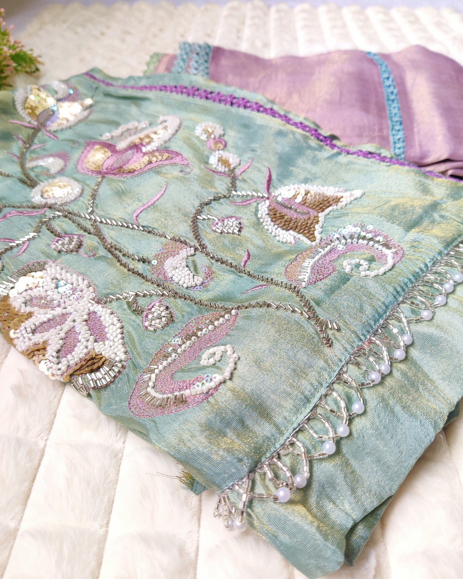 Elevate your ethnic wardrobe with the Nawabi lavender suit, an unstitched royal party wear set adorned with intricate cutdana sequin embroidery. This elegant fabric offers versatility for custom tailoring, blending traditional craftsmanship with contemporary style. Perfect for special occasions, it ensures a luxurious appearance with subtle shimmer, reflecting refined taste and sophistication.